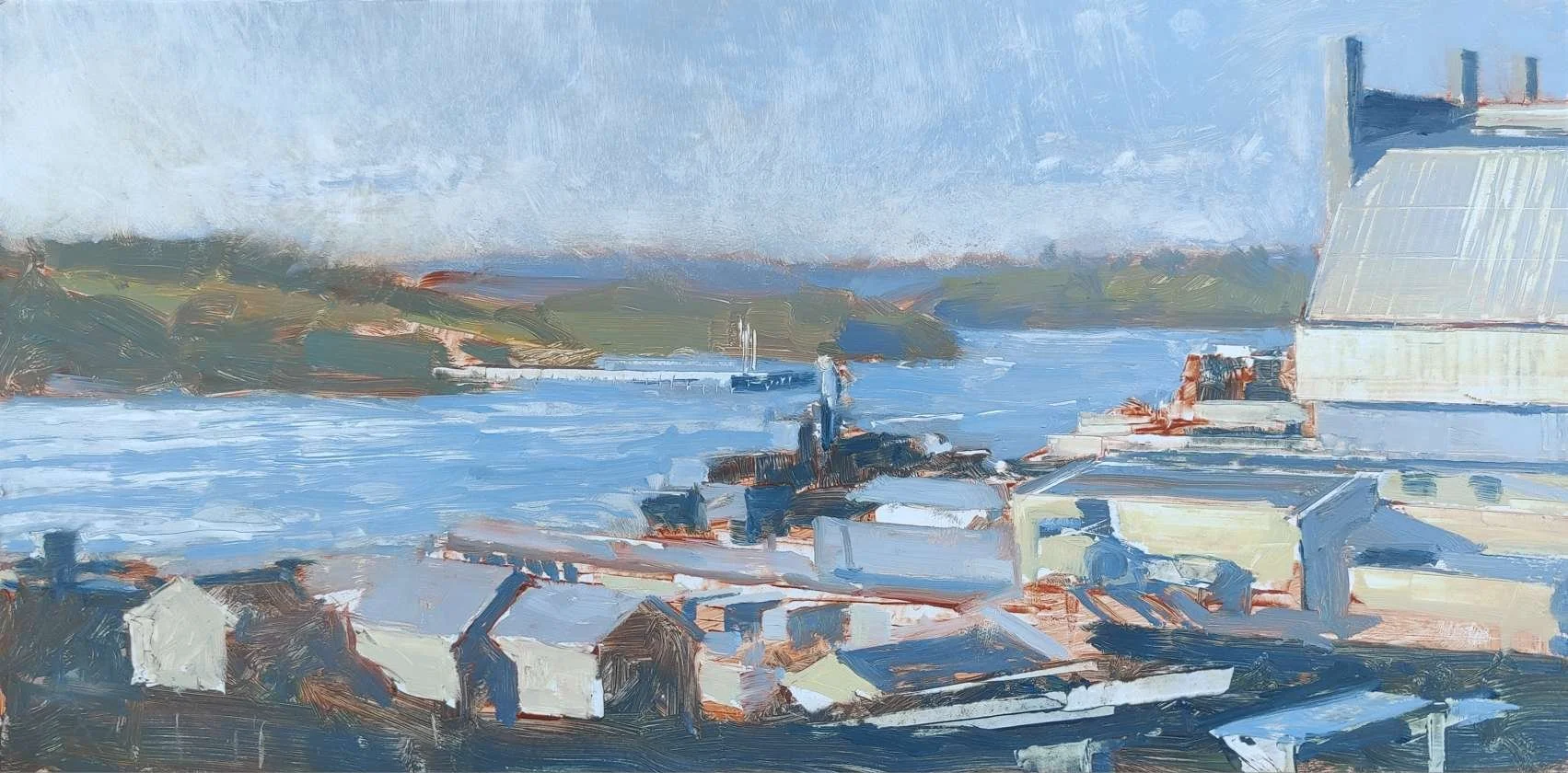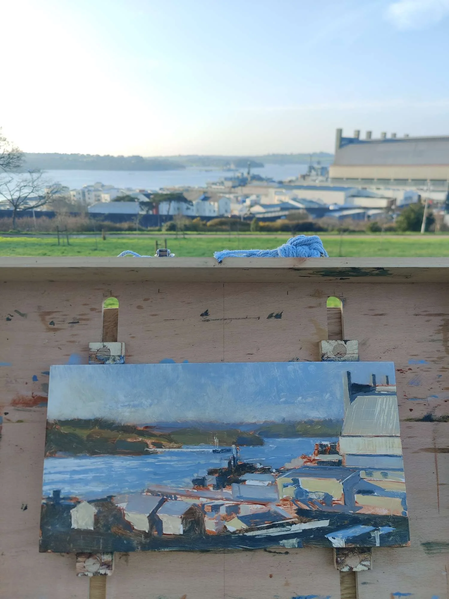 Next up, this view, painted from near Devonport Park and overlooking the Dockyard, has always been fascinating - there is so much movement and practicality here. Also, as the sun swings around in the afternoon, it bounces back at you from the river, completely altering the scene. This one is a work in progress, but I think it shows the confidence in my painting now. My marks are bold, and I am learning when to leave something which says enough. I love my treatment of the distant hills, where a few strokes of paint say all they need to say.