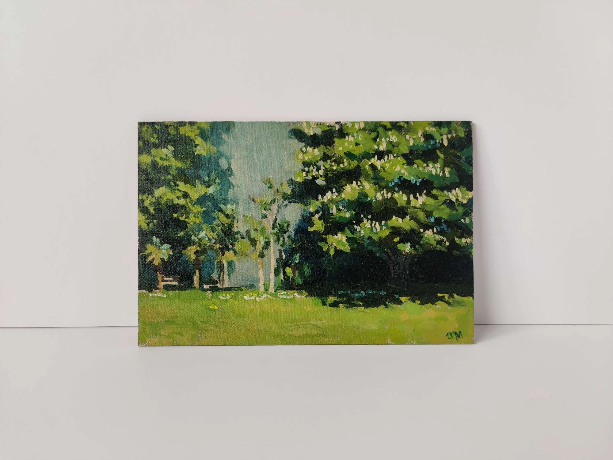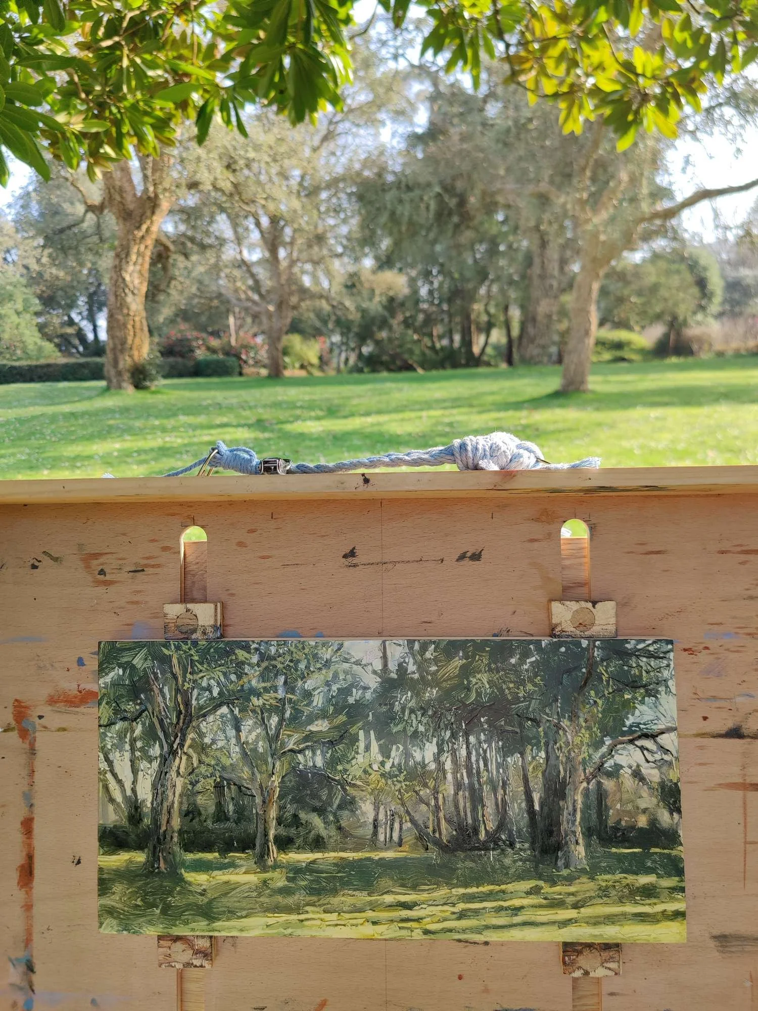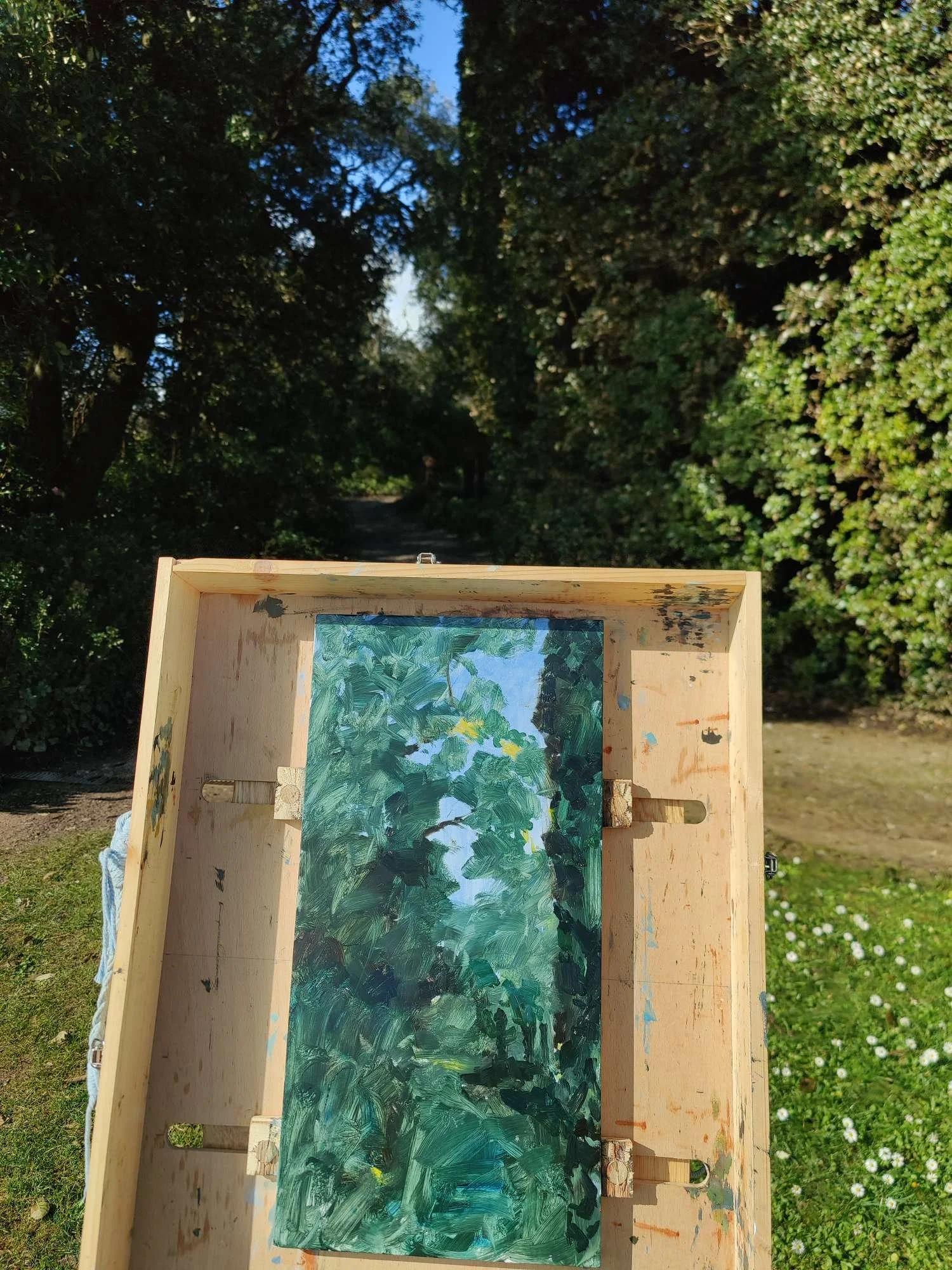 Saying that, I loved the view this work is looking at - a gap between the massive hedging and the shaded path, with slivers of sunlight creeping through, and a crystal blue sky sparkling between the shadowed leaves. So I will be back, whether to try on this panel again or to start a new one.