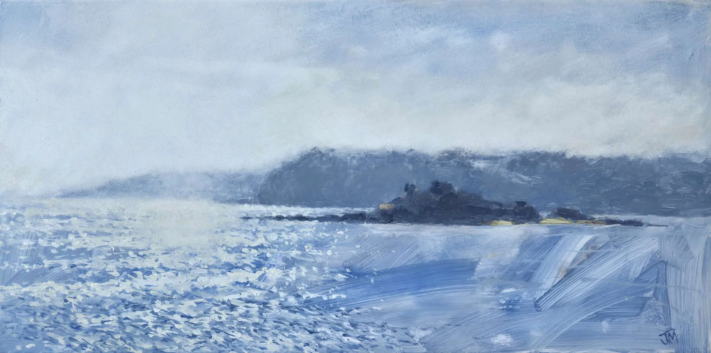 To capture this, I knew I needed to reduce the visual information down. I decided to leave out detail and event to reduce the amount of paint used, keeping thinner washes of colour for the sky, sea and land, even wiping and reducing these down to let the reflective nature of the smooth white panel to do its work. The one area I focused on was the details on the sea - that dazzling light and the suggesting of currents and tidal flows. Really there is very little in this painting, but I think that allows the calmness to emerge.
