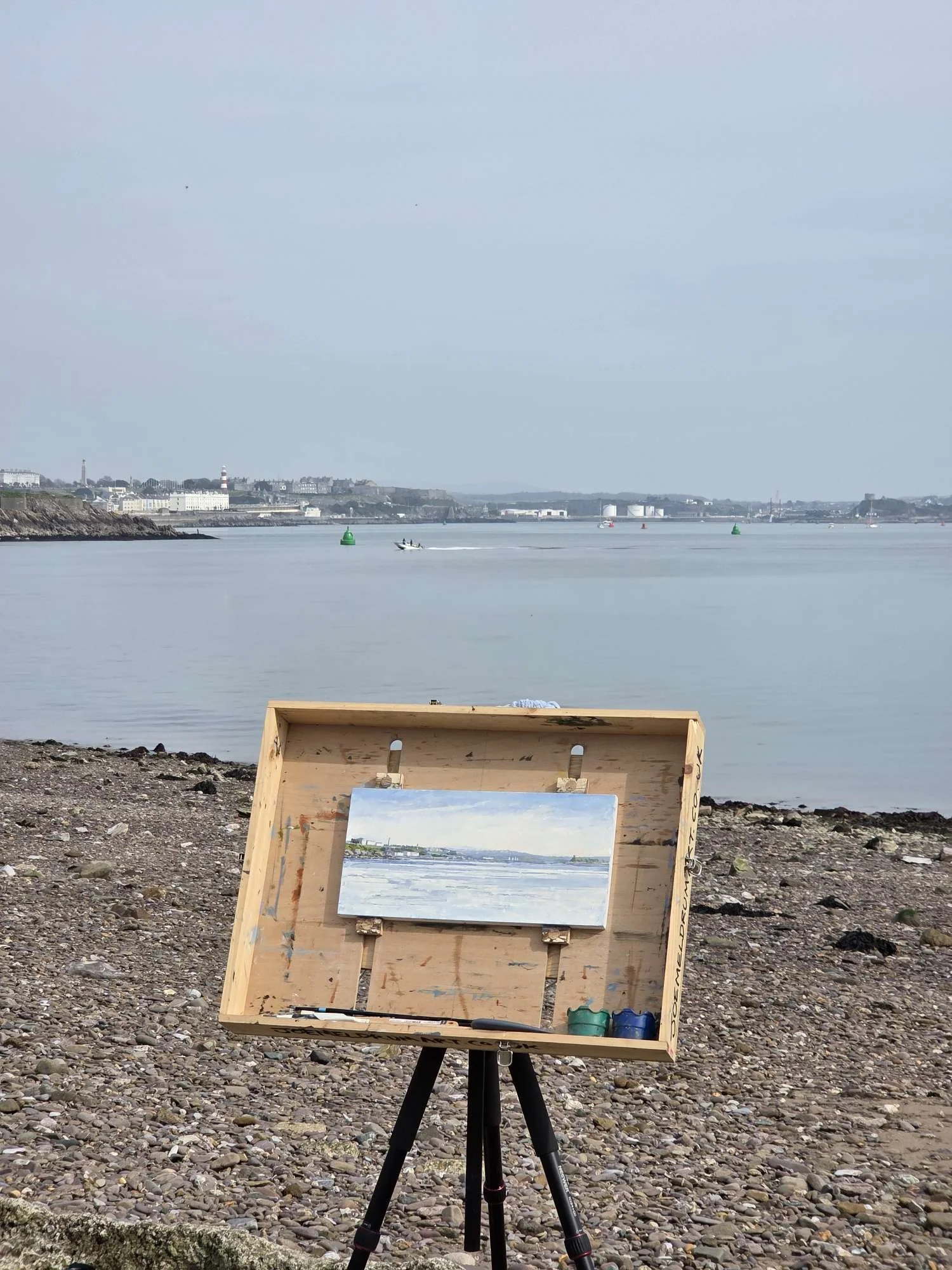 Then to the sea again! I’ve actually painted this view a year ago, on a smaller scale. But I was thinking about the calmness idea and wanted to try it with the light behind me. So another ferry trip over the Mount Edgcumbe, and I painted this from the main beach looking back towards Plymouth. The tide was rushing out, turning the bay into a calm pool as the tidal water pushed all the waves out to sea. It was quite a hazy day too and I wanted to take some of the learning from my previous painting a bit further forward. So this one was painted in just four or five colours, and 95% of it is a mix of ultramarine, sienna and white. Knowing what to leave unsaid was the issue! The sky and the sea, so tempting to fill with paint. But I managed to leave them roughly alone, letting my initial carving out with my scraper do most of the work. I really enjoyed capturing the distance and letting that sense of quiet and calm come through.