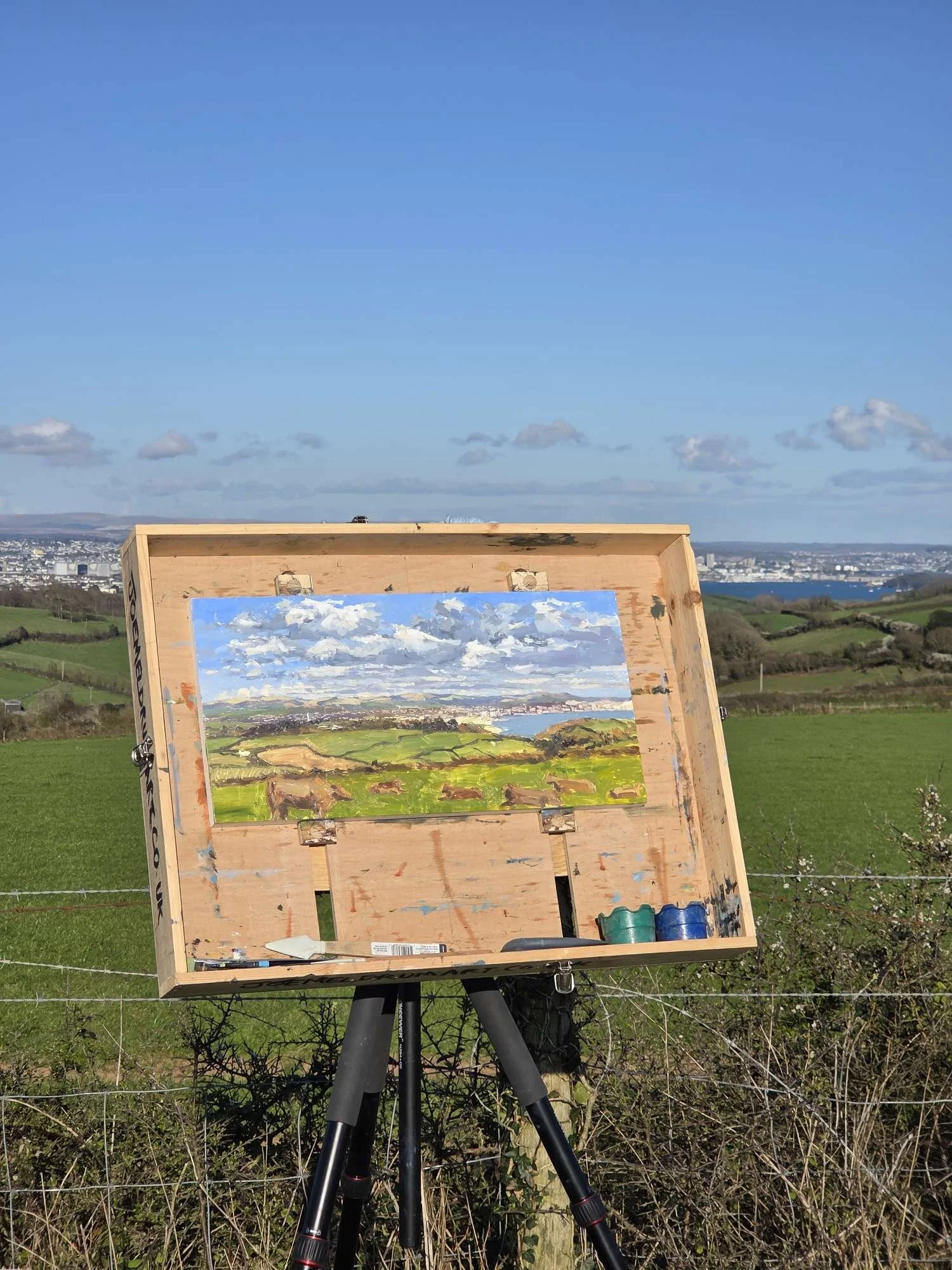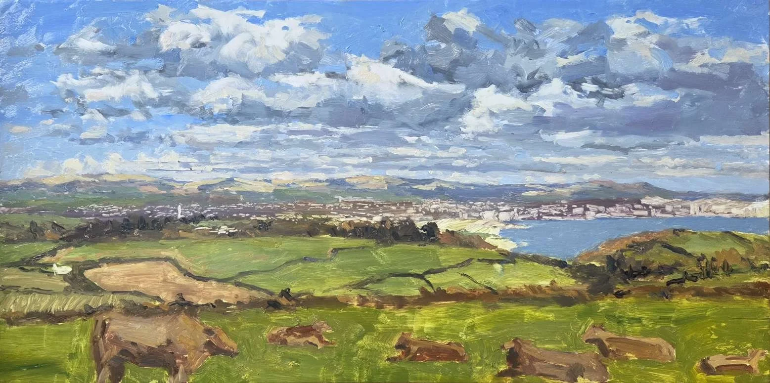 Finally, a clearer day with good visibility. I’ve had my eye on this view for a while - it’s up by Tregantle Fort, and you can see for miles and miles from here, all the way to Dartmoor in this direction. I love the light and shadows hitting the distant tors - a challenge to get the contrast needed, while keeping the sense of distance. The clouds were clearing rapidly, so I tackled them first, then the shadows and light on Dartmoor, and then the cows before they moved. I didn’t quite get to complete this one before the light and mood changed too much, so I’ll come back for a second session on another cloud-clearing afternoon.