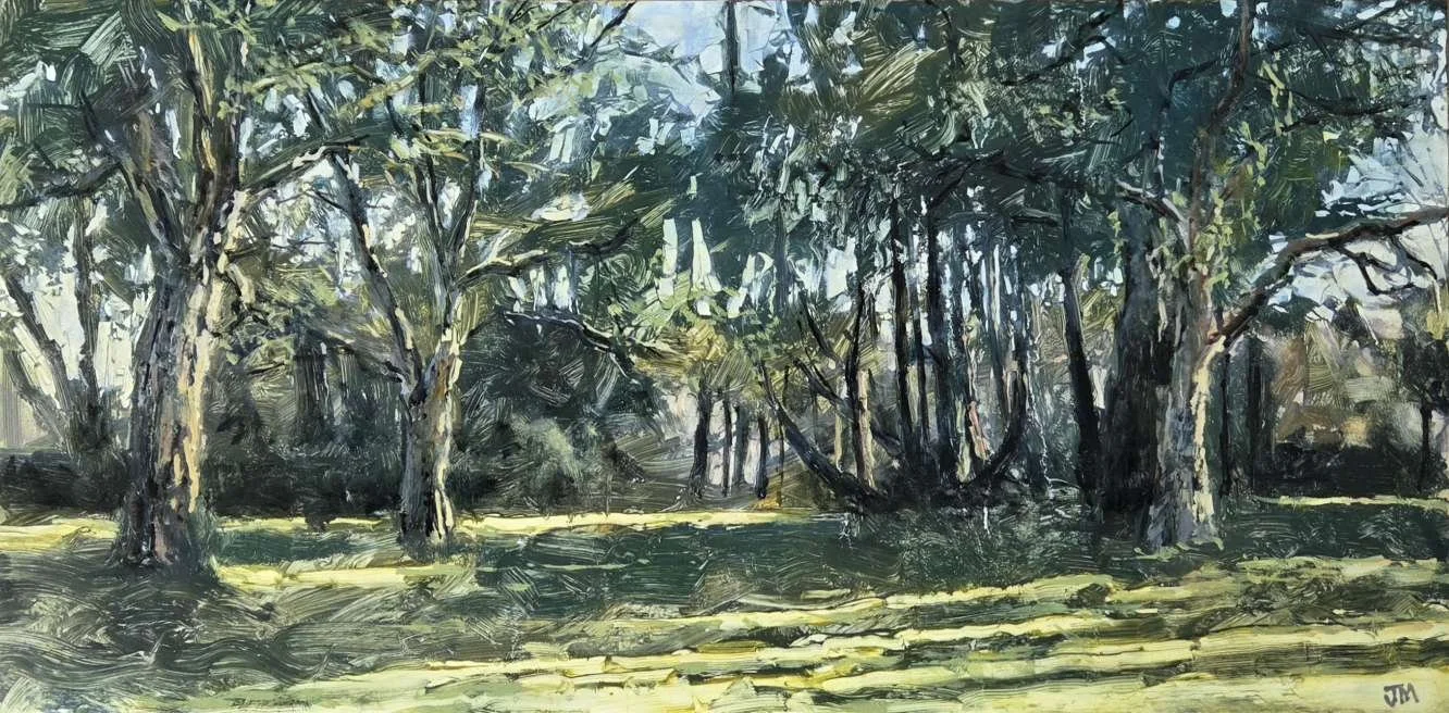 I got to head back to Mount Edgcumbe and finally finish the cork trees I started way back in January. I was waiting for a sunny but hazy afternoon, because this painting is all about the hazy golden light saturating and blurring everything in the distance, turning the gaps in between the trees and branches into soft, glowing spaces. I wanted to capture the sense of the hazy light washing around everything. I added some details where leaves reflected the ochre light, or shadows needed a bit more definition. But mostly this painting needed that soft light bleeding through. In the end, using more opaque (rather than transparent) colours in glazes helped - the opacity of the paint is still there, but thinning it in a glaze creates a burry middle ground. It’s kind of see-through, kind of not. And it kind of washes over the more distant trees, dulling them a bit and pulling them into the haze. I was so pleased this worked so well. As ever with this kind of painting, knowing when to leave it is a challenge. But I’m really happy with the feel of it and it’s hazy, semi-abstract nature. I love this piece and will be entering it into some painting competitions!