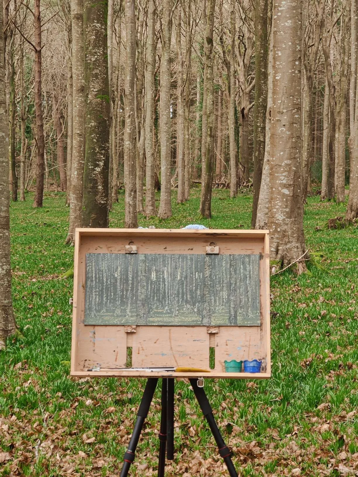 Before too long, it got too cold to continue (doesn’t a February feel a world away weather-wise now), and I had to head home. But I came back again in early March on a similarly overcast day to spend a little more time with this. Mostly, it just needed a little work to bring out some of the colours. But I found this process really hard to do without losing the carved mark-making, or destroying the muted, cold energy of the piece. What started to work was using transparent colours as glazes, softly bringing out some of the tones in the darker areas and nearer trees, and the colours of the fallen leaves and the emerging bluebell leaves on the forest floor.